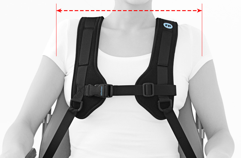 Die Weite des Gurts kann über den Verschluss auf der Vorderseite reguliert werden. Die Anordnung des Verschlusses reduziert die Gefahr, dass der Gurt in Richtung Halsausschnitt verrutscht.